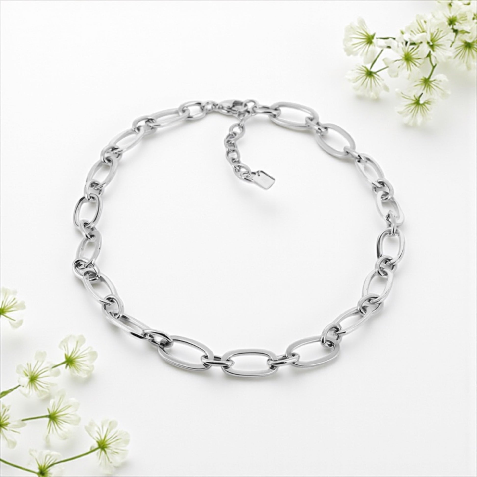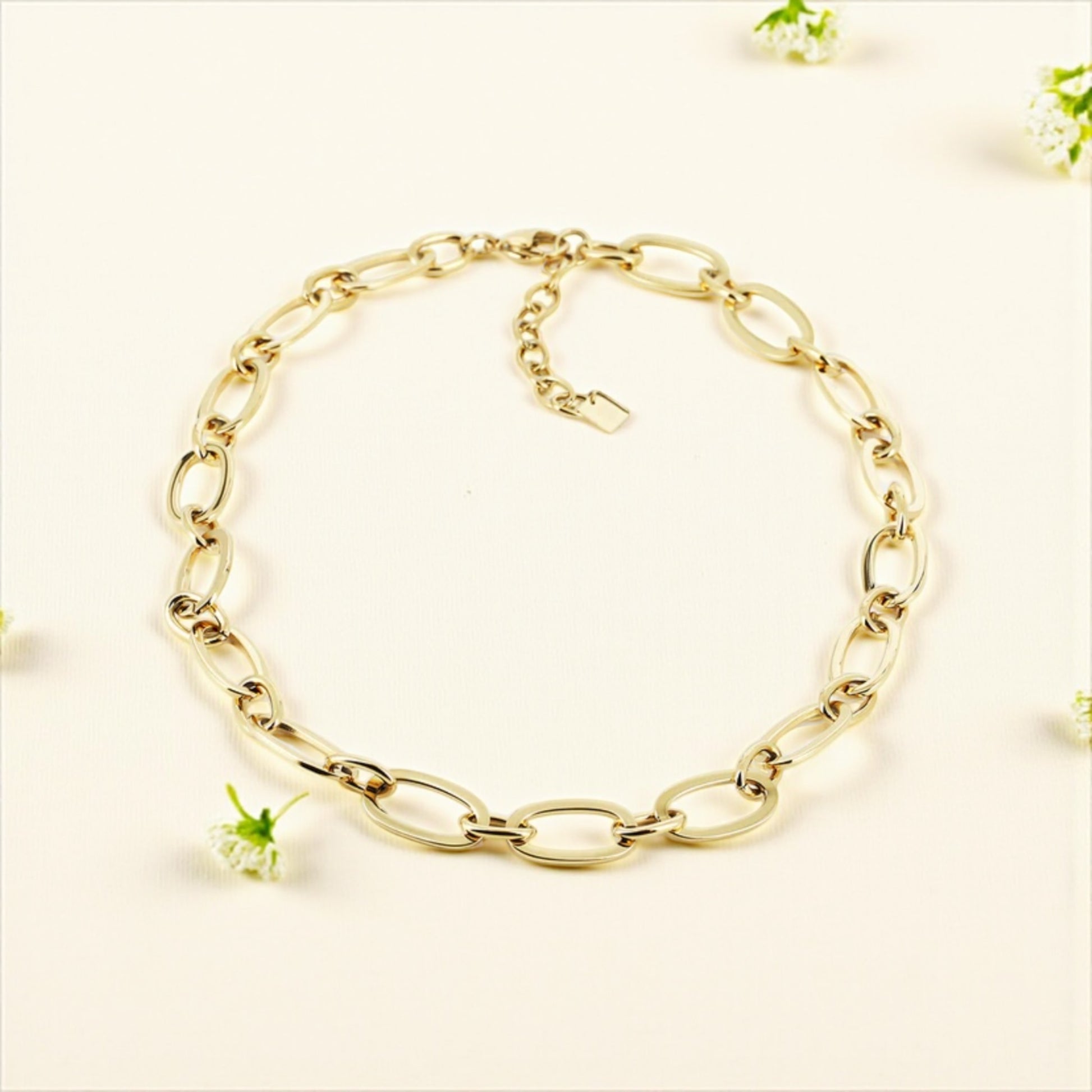 Collier chaîne formé de gros maillons en acier uni ou doré à l’or fin .