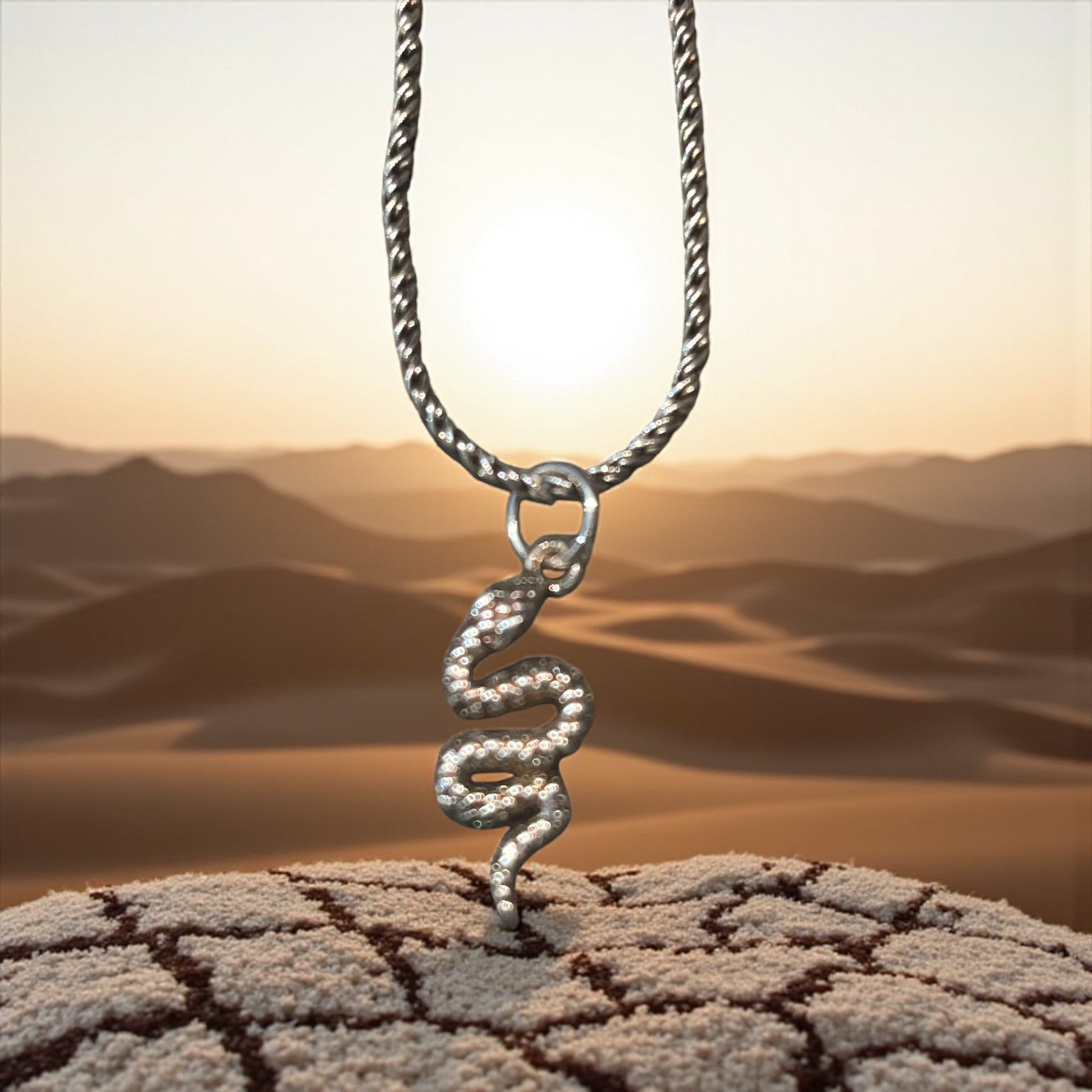 Collier pendentif en forme de serpent enroulé de très belle qualité en argent 925/1000e . Longueur 40 cm . Si vous désirez une chaîne plus longue nous contacter par mail .