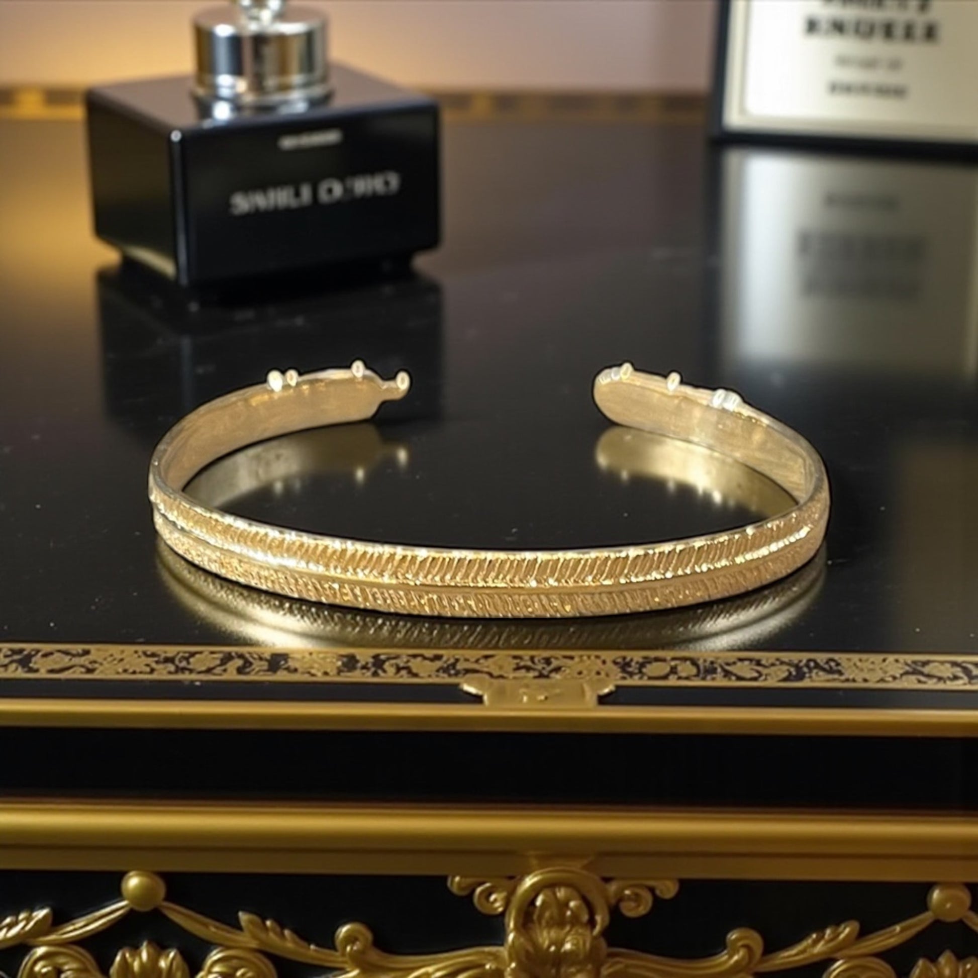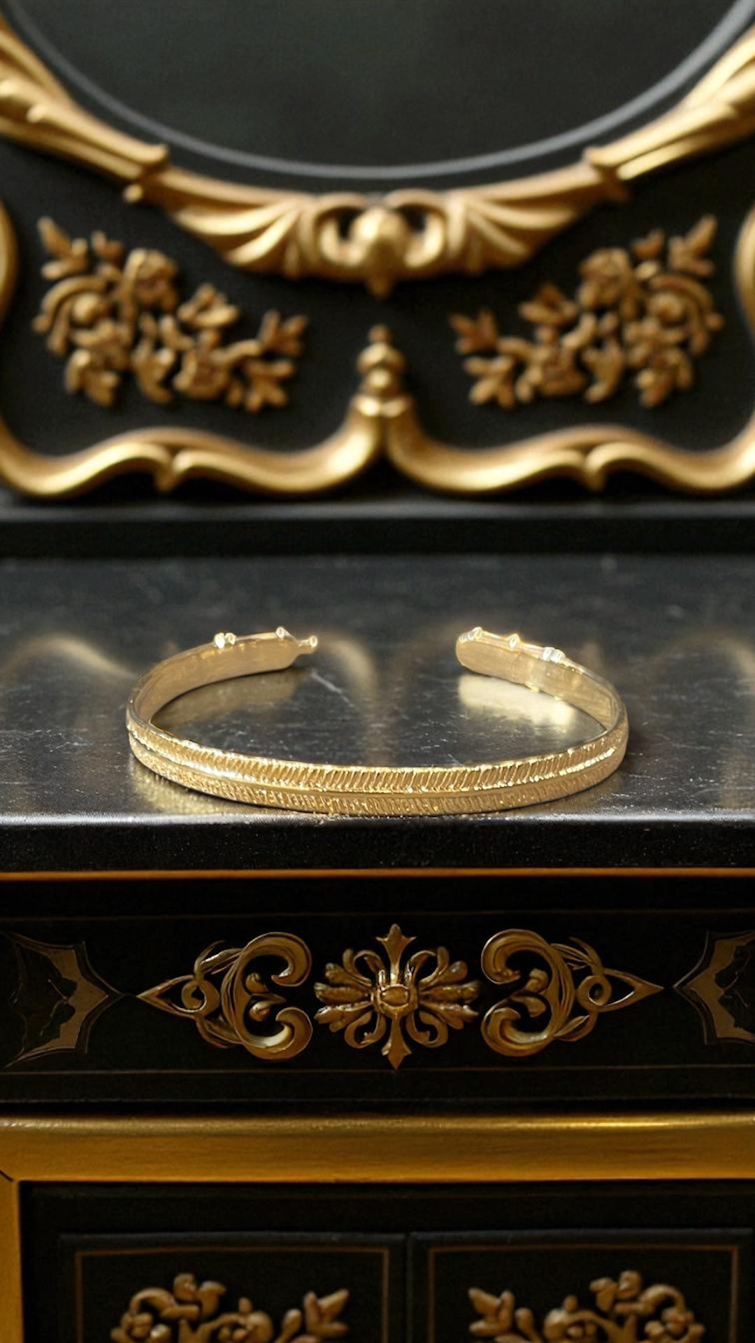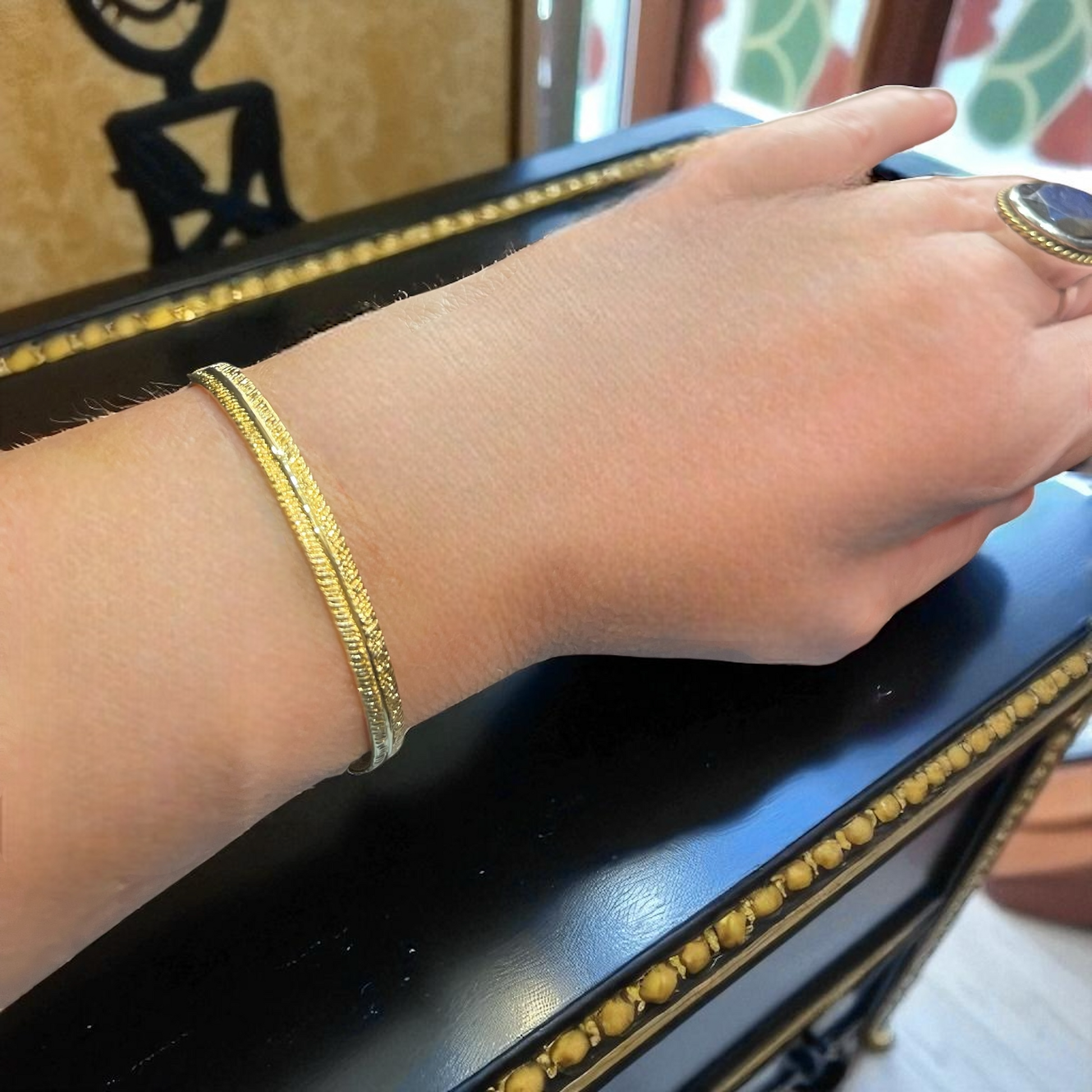 Jonc en plaqué or 3 microns de très belle qualité . Épouse parfaitement le poignet ajustable .
