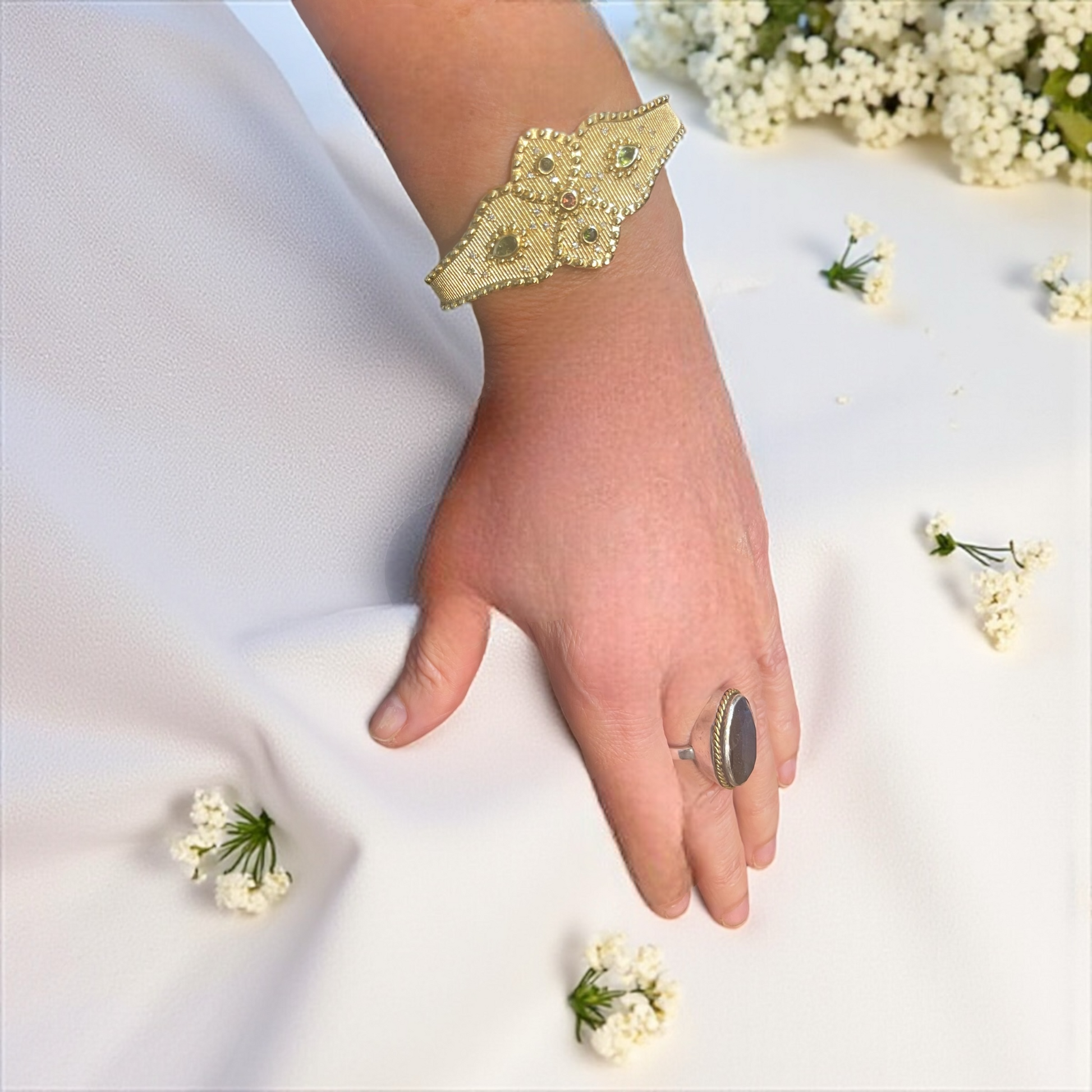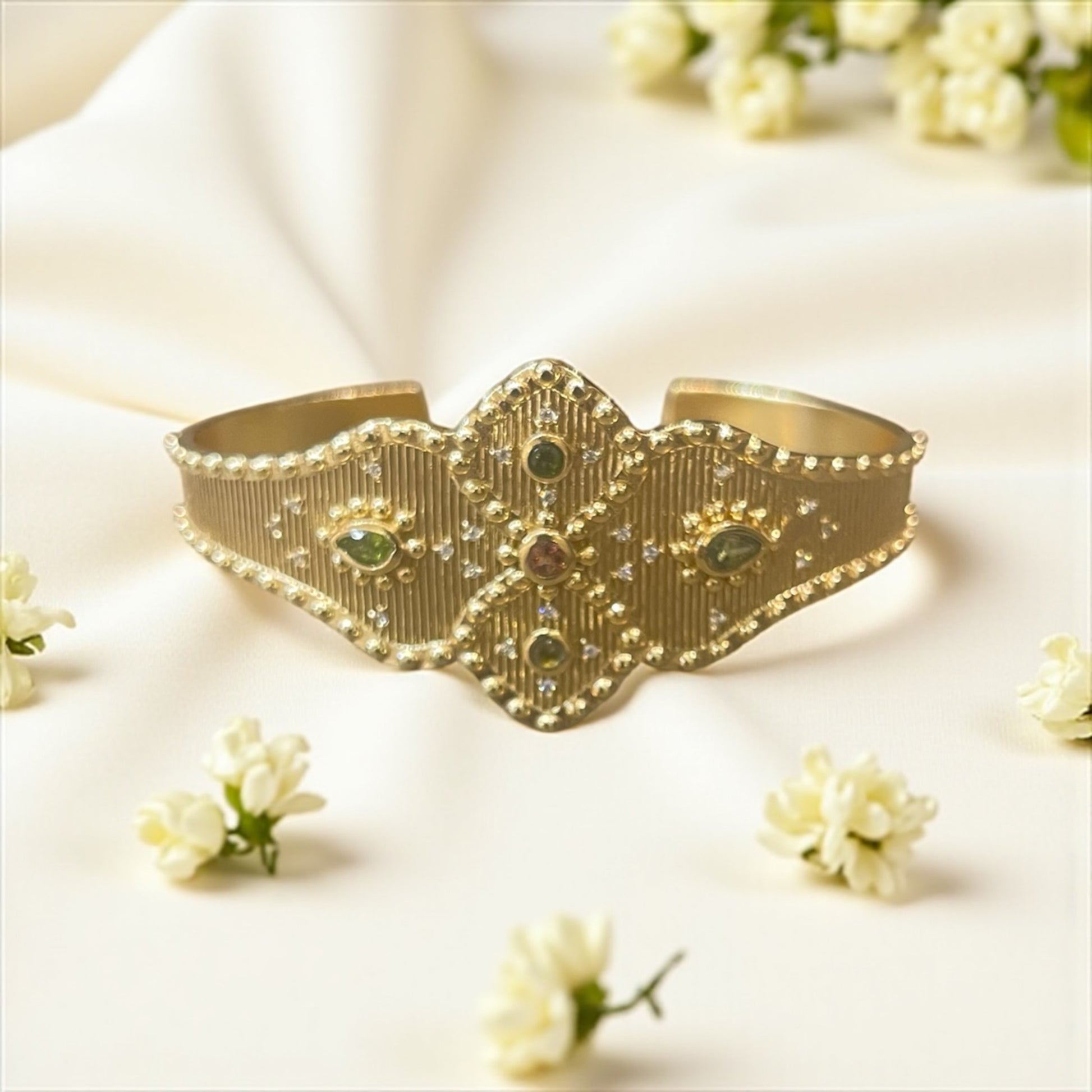 Manchette ALTHEA plaqué or, orné de tourmalines vertes et une rose en son centre . La tourmaline est connue pour apporter l'amour . Les pierres utilisées pour nos bijoux sont des pierres naturelles, aucune pierre ne se ressemble et les couleurs peuvent varier en fonction de la lumière.