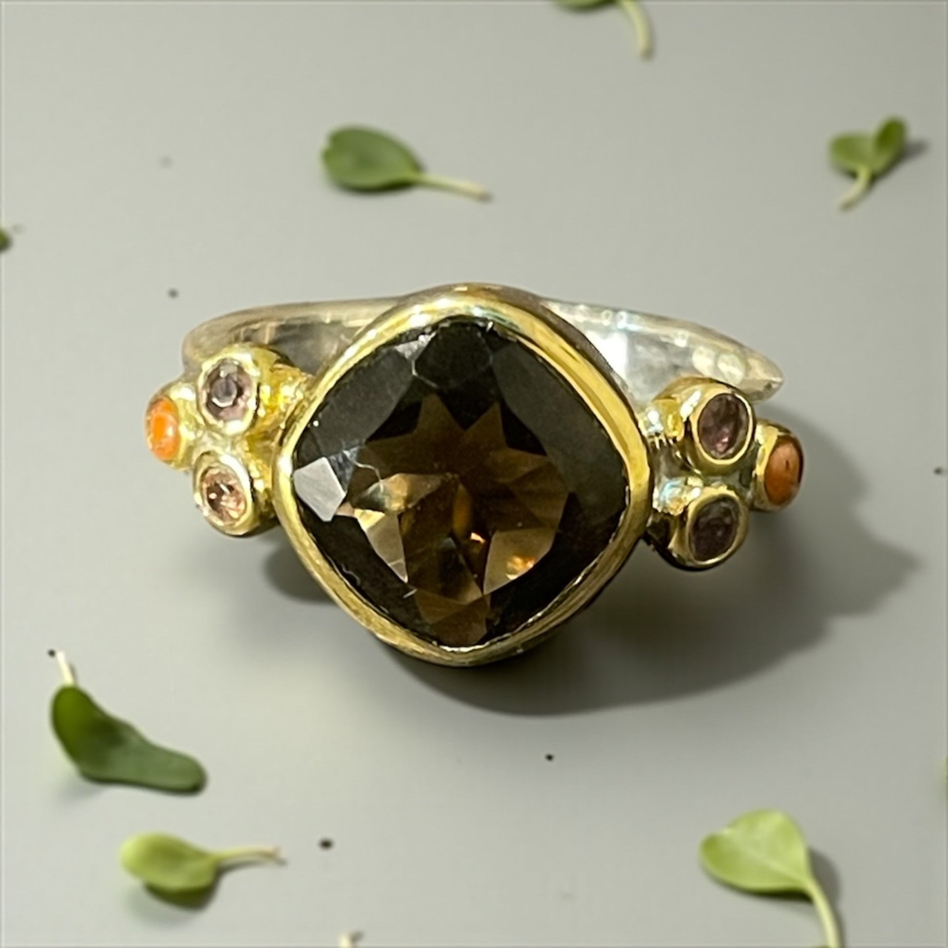 Bague en argent 925/1000e de très belle qualité et de fabrication artisanale et française . La pierre centrale est cerclée de laiton doré pour donner plus de luminosité à la pierre centrale. De part et d'autre de la pierre à gauche et à droite il y a 3 petites pierres véritables . La bague Aphrodite existe en quart fumé avec pierres de cornaline et de tourmaline sur les côtés , en topaze bleue et blanche sur les côtés , et en améthyste verte améthyste violette et nacré sur les côtés .